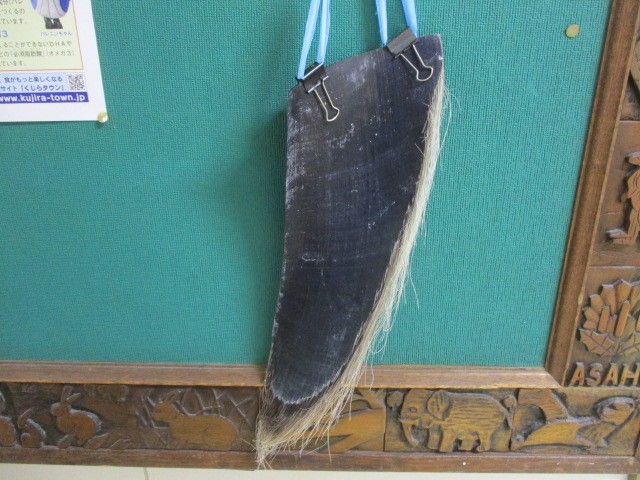 今日の給食は、クジラを使ったクジラのオーロラ煮を提供しました。クジラには、「バレニン」という栄養が含まれており、疲労回復に効果的と言われています。臭みが強いクジラですが、下味にしっかり漬け込むことで軽減し、子供たちもおいしいと言って食べていました。また、給食室前には、クジラのひげを展示し、子供たちに触ってもらいました。