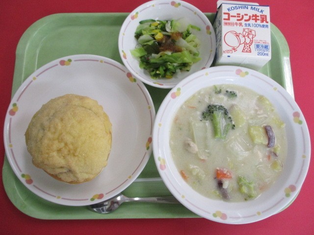 今日の給食は、パンにクッキー生地を塗って焼き上げた「手作りメロンパン」を提供しました。クッキー生地がさくさくとおいしく、子供たちも大興奮でした。また、パンに合わせて今が旬の野菜をたっぷり使ったクリーム煮を作りました。