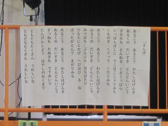 歌うのは「さんぽ」ですから、1年生も一度ならず聞いたことがあるでしょう。