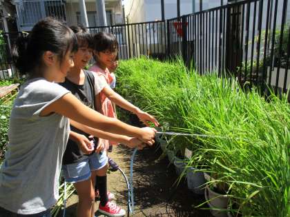 5月に苗を植えて育て始めたバケツ稲は、夏休みも交代で水やりを行ったおかげで元気に育っています。2学期になってからも休み時間にはみんなで水やりに行き、稲の成長を楽しんでいます。そろそろ収穫の時期が迫っています。10月13日の3,4時間目に出前授業で、稲刈りと脱穀を行う予定です。虫や鳥に食べられてしまわないように最後まで気を抜かずに育てていきます。