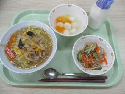 【今日の献立】 みそラーメン 春雨サラダ 白玉フルーツポンチ 牛乳