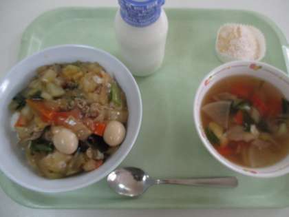 【今日の献立】 中華丼 豆腐の中華スープ おからのカップケーキ 牛乳