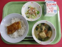 【今日の献立】・牛乳・ご飯・いかのかりん揚げ・こまツナサラダ・あつあげのとろみ汁...