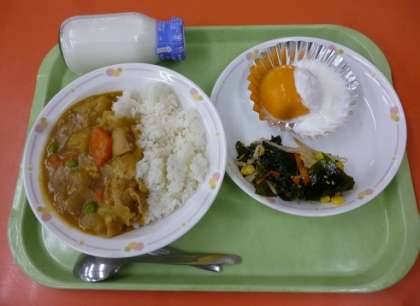 カレーライス 福神漬け わかめサラダ 桃缶ヨーグルト 牛乳