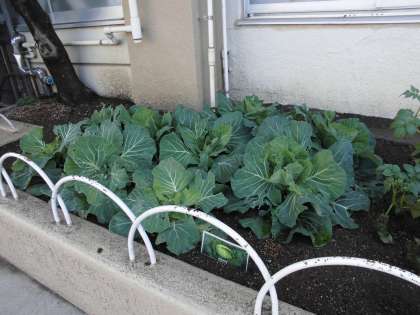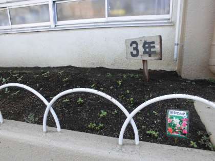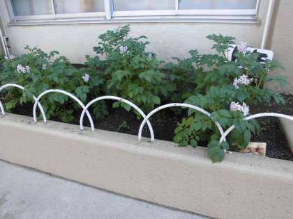 今日の学級園の様子です。上からホウセンカ、ジャガイモ(花がきれいに咲いていますね)、キャベツです。