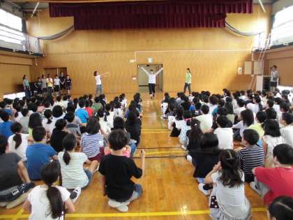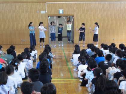 今日の児童集会は、集会委員会による「この先生はだれでしょう集会」でした。集会委員会に呼ばれた3人の先生方や主事さん方のうち、ある1人の方の特徴や好きなことを紹介し、それが三人のうちの誰かを当てるゲームでした。1年生にも学校の先生方を知ってもらおう、と集会委員会の皆さんが考えてくれた集会でした。
