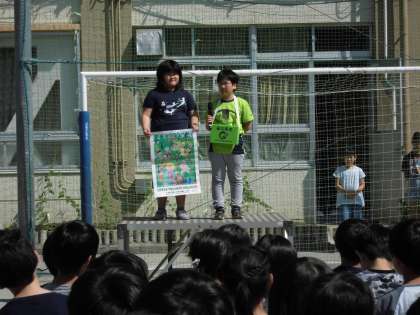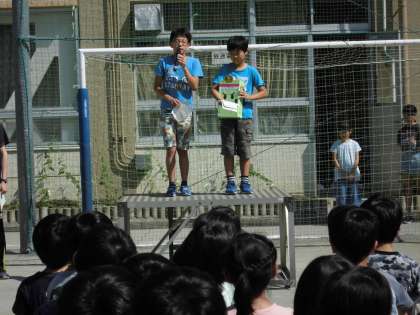 今日の全校朝会では、代表委員会より「かしわくんボックス」について、JRC委員会からは「緑の募金が水曜日から始まる」というお話、運動委員会からは、「大縄大会の記録」についてのお話がありました。