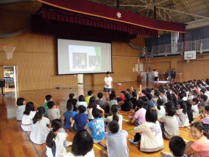 今日は、給食委員会集会がありました。タブレットパソコンを使って全校児童に発表することができました。