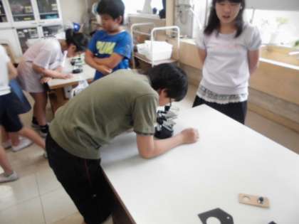 理科の学習でメダカがどのようにして成長するのかを調べました。子供たちは、池などにはメダカよりも小さな生き物がいて、メダカはそれを食べていると予想しており、顕微鏡で池一の池の水を観察しました。