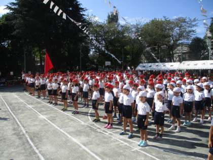 昨年は雨の中の運動会でしたが、今年は素晴らしすぎるお天気の中での運動会となりました。いよいよ始まります。