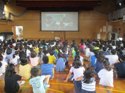 今日のISS朝会は、今年度池一小が特に重点項目としてあげている「心のけが」(いじめ)についてのDVDを見て、みんなでいじめ防止について考えました。