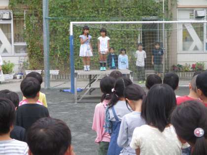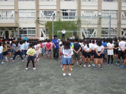 今日の全校朝会では、校長先生より「体育の日」そして、今日本で行われているラグビーのワールドカップについてのお話がありました。また、スピーチでは1年生が運動会の思い出や、今頑張っていることについて、全校児童の前で話すことができました。