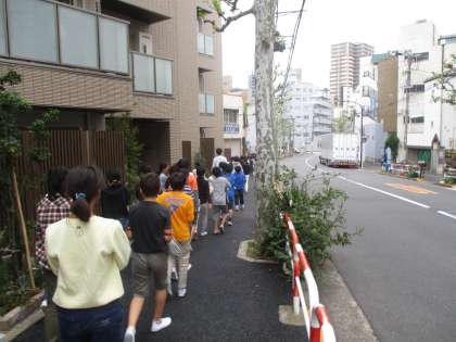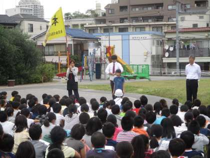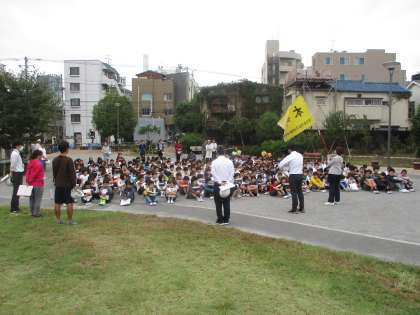 今日は2時間目に避難訓練がありました。今日の想定は、授業中に学校北側の近隣から出火し、学校に留まるのは危険なので第二次避難場所へ移動する、というものでした。今回は初めて「くすのき公園」を避難場所として、全校児童で歩いて向かいました。
