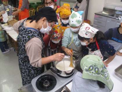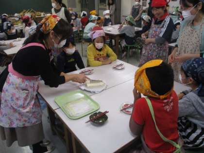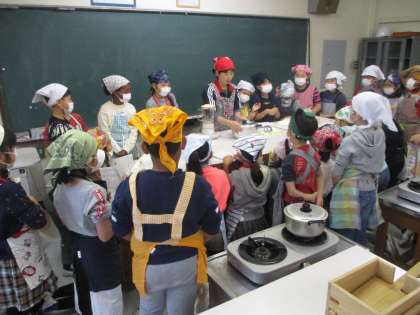 国際理解教育教室とは違いますが、この日はその他にも様々な授業が行われました。3年生は1時間目〜3時間目を使って「豆腐づくり」を行いました。保護者の方々にも協力していただき、おいしい豆腐ができました。