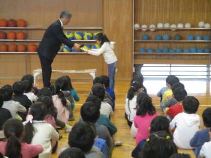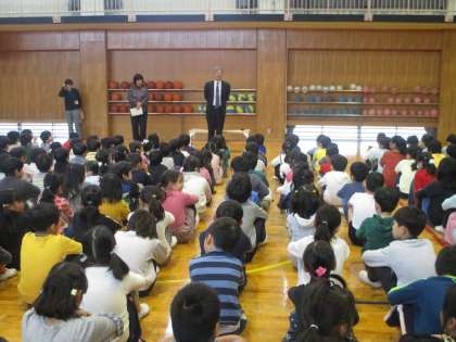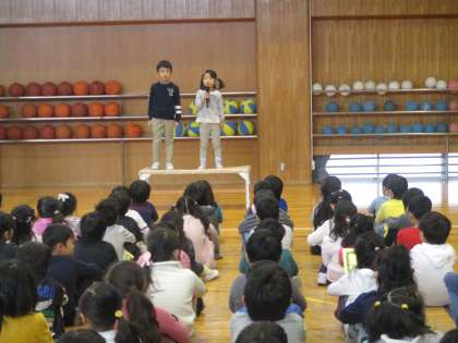 この日の全校朝会では、校長先生から「暴力は絶対にしてはいけません!」というお話があり、みんな真剣に聞いていました。またその後は、一輪車検定の表彰と1年生によるスピーチがありました。