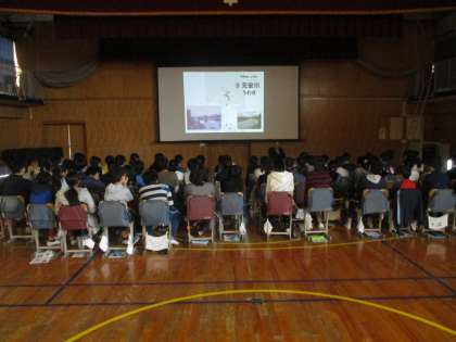 今日の5,6時間目に6年生が体育館で「原爆先生の特別授業」を受けました。ちょうど社会科の歴史学習で戦争時代のことについて学んだ後だったので、どの子もとても真剣に話を聞いていました。
