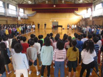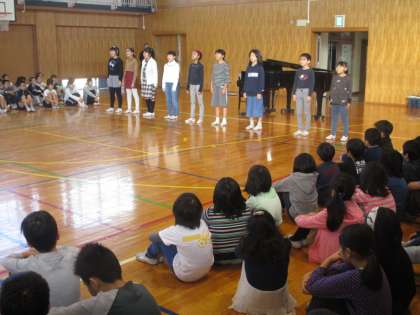 今日の朝は音楽朝会でした。全校児童で「もみじ」を2部合唱で歌いました。途中で5,6年生の歌の上手なお兄さん、お姉さんがみんなの前で見本を見せて聴かせてくれました。低学年の子供たちからは、「声がそろっていてきれい。」「みんな大きな声で歌っている。」などなど、素晴らしい感想も聞かれました。最後はもう一度みんなできれいな声で歌いました。