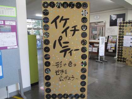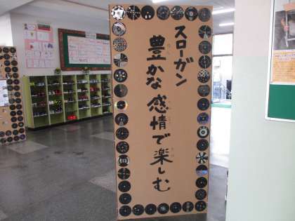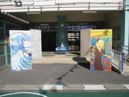 学校の中央昇降口のようすです。「ようこそ!展覧会へ!!」