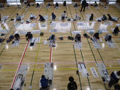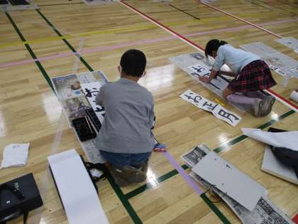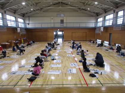 今日の3,4時間目、3年生が体育館で書き初めを行いました。3年生は、初めての毛筆での書き初めで「お正月」と書きました。