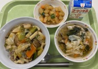 麦入りご飯 厚揚げの中華風煮辛味サラダシャインマスカット牛乳