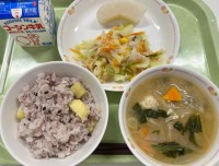 さつまいも入り黒米ごはんツナサラダとり入り味噌汁梨(新高)牛乳