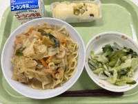 豚骨風ラーメングリーンサラダさつまいも蒸しパン牛乳