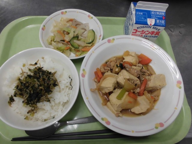 今日は、10月2日で「豆腐の日」にちなんで「肉豆腐」です。豆腐は、大豆からできる豆乳を固めて作った物で、消化がよく栄養価の高い食べ物です。豆腐は2000年以上前に中国でつくられました。奈良時代に日本に伝わり、精進料理でも使います。豆腐美人と言われるようにつややかな肌を作るビタミンEがはいっています。ビタミンEは血液の流れをよくし、老化防止にも役立ちます。