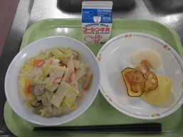 今日10月7日から9日の3日間おこなわれる「長崎くんち」というお祭りがあります。国の重要無形文化遺産にもなっています。「龍踊(じゃおどり)」や「鯨の潮吹き」「太鼓山(コッコデショ)」など、ポルトガルやオランダ、東南アジアなどの南蛮(なんばん)の風合(ふうあ)い」など、ポルトガルやオランダ、東南アジアなどの南蛮の風合いのダイナミックなだしものが多くみられます。今日はそんな長崎の郷土料理である「ちゃんぽん麺」をアレンジしてみました。まろやかになるように牛乳もいれています。日本にあるいろいろなお祭りを調べてみるきっかけに給食がなればうれしいです。今日の梨は「南水」という品種です。