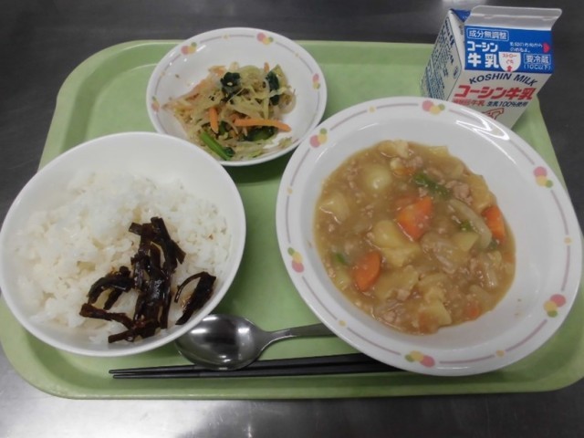今日は炊きたての白いごはんに合うように、茎わかめの佃煮は少し濃いめの味付けにしてみました。ごはんと一緒に食べましょう。茎わかめには、おなかの調子を整えてくれる「食物せんい」や体のもととなるカルシウムやマグネシウムという「ミネラル」をたくさん含まれています。これらの栄養をしっかり体に取り込むためには、よくかんで食べることが大切です。茎わかめのように、食物せんいが多くてかみごたえのる食材は、一口30回ほどかんで食べることで、消化がうながされ栄養が体にとりいれやすくなり、体の調子が整いやすくなりますよ。自分の体のために、何回くらい噛んで食べているか意識しながら食べてみましょう。