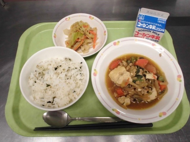 学習発表会のリハーサル連日おつかれさまです。今日の「肉豆腐」の【豆腐】や【牛乳】には、緊張をおさえたり、ストレスを軽減したりする効果が期待できる「トリプトファン」がはいっています。トリプトファンを材料に生産される「セロトニン」は幸せホルモンともよばれ、気持ちを安定させる効果があるとされています。トリプトファンは食べ物からとる必要があります。【豆腐】や【牛乳】しっかり食べて明日と明後日の学習発表会をがんばりましょう。