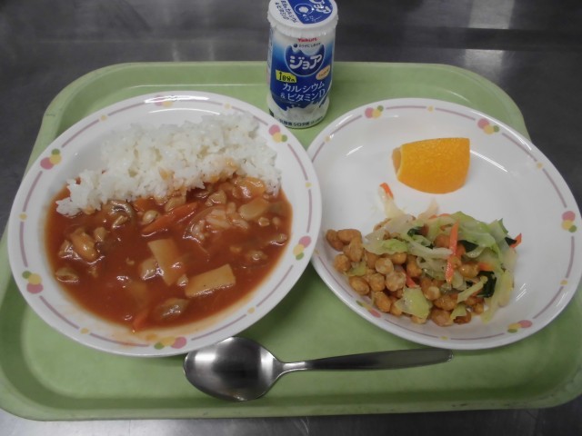 今日は、トマトの酸味とうま味が食欲をそそる「ハッシュドチキンライス」です。トマトにふくまれるビタミンCは体の調子をととのえます。また、サラダの大豆はカリッと揚げて、歯ごたえもあります。そして今日は、飲むヨーグルトである「ジョア」がついています。いつもの牛乳(200ml)より、ジョア(125ml)は量は少なめですが、実は1日分のカルシウムが入っていて、カルシウムには、骨を強くするたけでなく、リラックスの効果もあります。