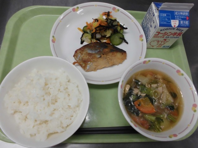 今日は宮城米給食の日す。今日の「ごはん」は豊島区と平成17年に相互交流宣言をした宮城県から無償でご提供いただいた「ひとめぼれ」の新米です。「ひとめぼれ」という名前は、「見て美しさにひとめぼれ、食べておいしさにひとめぼれしてもらい、日本全国で愛されるお米にしたい」という願いがこめられているそうです。宮城県の農家の方々に感謝していただきましょう。主菜はさわらを仙台みそにつけて、焼きました。仙台みそは、長期熟成させる米みその一種で、大豆の比率が高く、色が濃い赤褐色で旨味が強いのが特徴です。伝統的な味噌で、伊達政宗公の時代から続く歴史を持ちます。汁物(しるもの)は、宮城県の郷土料理である「おくずかけ」です。山でとれたくずでとろみをつけていたことが名前の由来です。本来(ほんらい)は、宮城県の特産の温麺(うーめん)や豆麩(まめふ)をいれる汁物です。今日は、温麺(うーめん)のかわりに、しらたきをいれて、かたくり粉でとろみをつけました。
