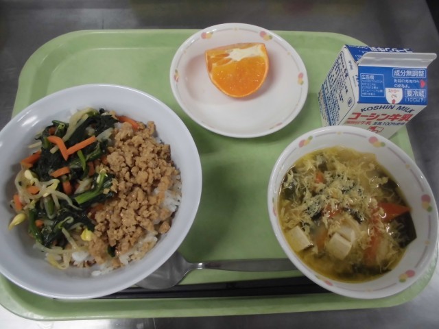 今日は、肉そぼろとナムルをごはんの上にのせて食べる「ビビンバ」です。「ビビン」は【まぜる】で、「パフ」は【ごはん】という韓国語です。ごはんと混ぜながら食べましょう。わかたまスープの「わか」はわかめ、「たま」はなんでしょうか。今日は、「たまご」と「たまねぎ」でした。