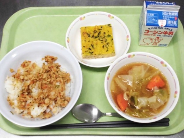 毎月19日は「食育の日」ということで、今日は東京都でとれた食材をたくさん使った献立です。まずそぼろごはんの「メダイ」は東京都の八条島でこの秋にとれた新鮮なメダイを八丈島の女性部【浜のかあさん】たちがミンチにしてくださったのが届きました。10月の台風で被災し冷凍庫がダメになってしまい全ての食材が廃棄になってしまったそうです。その後漁も再開されて、少しずつ流通も再開しています。学校給食に提供するには、まだまだ十分ではありませんが、今週5年生が八丈島の【浜のかあさん】の出前授業をうけ、トビウオやトミメ、ムロアジといった実物から学ぶ機会をいただき、給食でのメダイの提供も実現しました。野菜も都内の農園で大切に育てられた小松菜や白菜、大根、里芋、キャベツです。新鮮で甘い旬の味を美味しくいただきましょう。