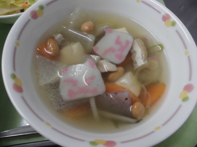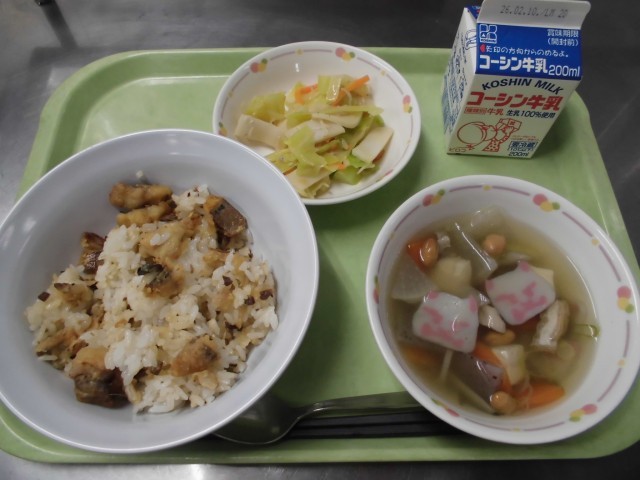 節分は、季節の分かれ目に起こりがちな病気や災害を鬼に見立てて、それを追い払う行事です。鬼である「魔」を「滅」することから「魔滅」→「豆」となり、大豆で豆まきをして、無病息災(病気がなく元気なこと)を願います。また、一般的には「鬼は外、福は内」というかけ声ですが、地域や鬼を祭るお寺では「鬼も内」という場所もあるそうです。豆まき以外にも、節分には「柊鰯」(西日本では「焼臭(やいがかし)」という、鬼が苦手な、匂いの強い「イワシ」と尖った「柊」を飾り、魔除けや厄除けとする風習もあります。今日の給食は、鬼が苦手な鰯を使った「鰯のかば焼き丼」と、鬼のかまぼこと煎り大豆がはいった「魔滅五目汁」です。自分の中の追い出したい弱いところ=鬼はなんですか?しっかり食べて追い出しましょう!