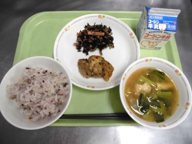 今日はそんな梅の実からできた梅干を献立にとりいれました。鶏肉に赤しそと梅ので下味をつけて焼いた「鶏肉のうめしそ焼き」です。さっぱりとして、ごはんがすすむあじつけです。ひじきの炒め煮にはいっているひき肉ににていうる食べ物は大豆ミートです。よく味わうと大豆の甘みがありますよ。