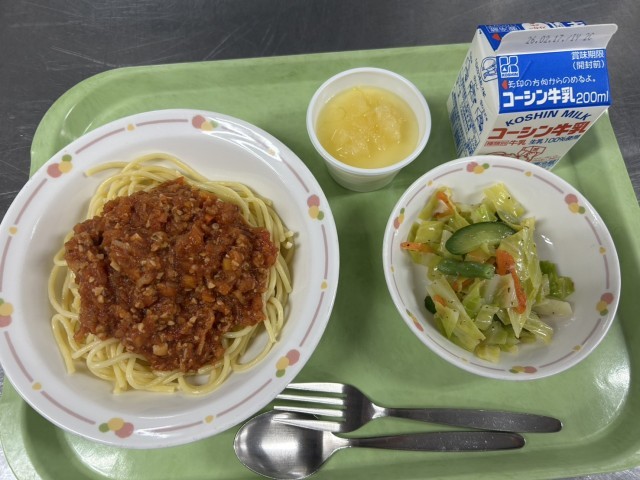 今日は、ミラノ・コルティナ2026冬季オリンピックにちなんでイタリア料理の給食です。ボロネーゼは、いつものミートソースより少しあらびきのひき肉を使い、甘味をおさえた濃厚なソースに仕上げています。イタリアンドレッシングは、バジルなどのハーブをつかい、野菜がおいしく食べられる 味付けにしました。パンナコッタはパンナが「生クリーム」、コッタが「調理した、火を通した」という意味のイタリアのデザートです。パンナコッタの上にかけたセロナップソースは、「パイナップル」と、しゃきっとした「セロリ」という意外な組み合わせの、でもさわやかで濃厚な生クリームのパンナコッタをさっぱり食べられる味わいです。