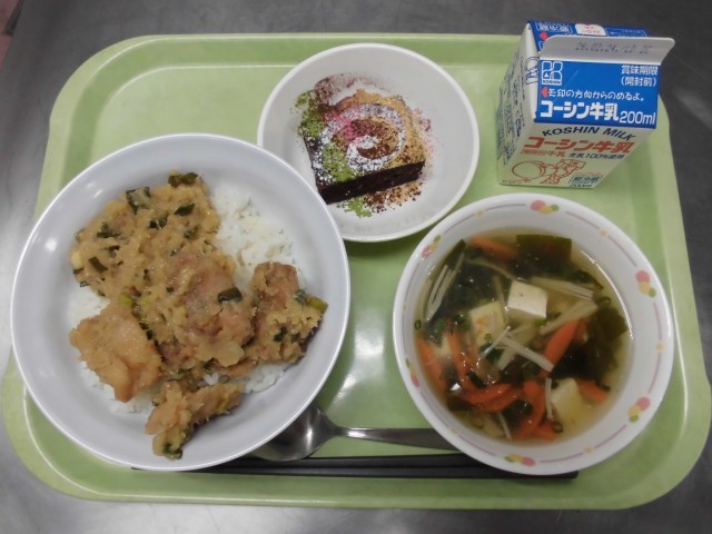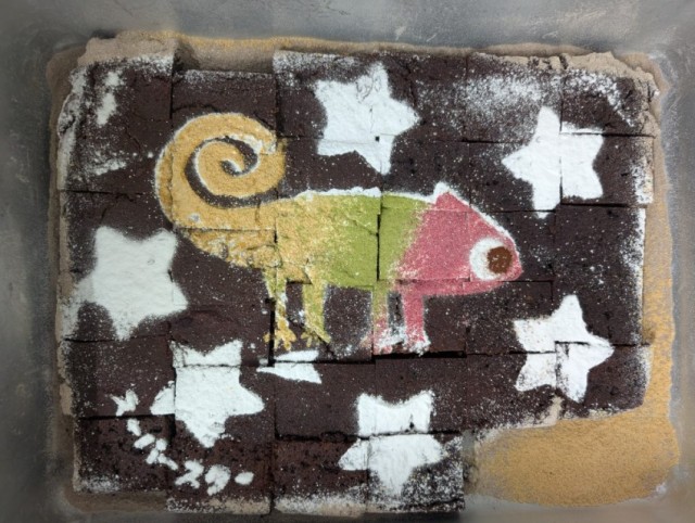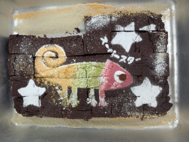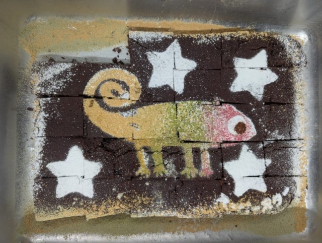 今日は、「あゆみ学級★まとめ展がんばれ給食」です。2月21日(土)に池三小で「まとめ展」がおこなわれます。「スーパースター★じぶんだけのいろ」をテーマに発表します。その中で、レオ・レオニの絵本「じぶんだけのいろ」の世界を描きます。あゆみ学級のみなさんが自分らしい色を輝かせられるように、給食室からもエールをこめて、自分だけの色をもったカメレオンを表現したケーキをつくりました。