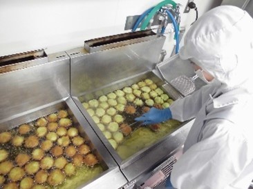 今日の宮川さんの献立は、はじめ「小松菜サーターアンダギー」でした。調べると「サーターアンダギー」は沖縄の郷土料理で、卵の水分だけで作り、外側はサクサク、中はギュッと詰まった濃厚な食感で、常温で数週間日持ちするお菓子です。今日の小松菜ドーナッツは、卵は使用しない代わりに小松菜を茹でてミキサーにかけて丸ごと使用し、牛乳も加えた、外はカリっと、中はふんわりの仕上がりです。ぜひ出来たてのおいしさを召し上がれ~♪