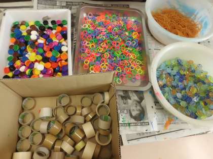 いろいろな材料の色や形をいかして、並べ方を工夫し、図工室の机の上に顔を表してみました。材料を重ねてみたり、色合いを考えてみたりするなど、それぞれが表した顔を最後に見合い楽しみました。