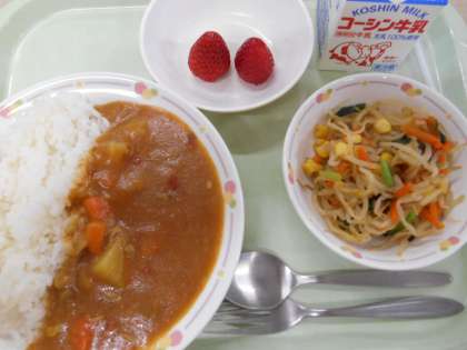 今日のおすすめメニューは「チキンカレーライス」です。カレーライスは、昨年度池三小で一番人気のメニューでした。今年度もたくさん食べてくださいね。(お昼の放送)