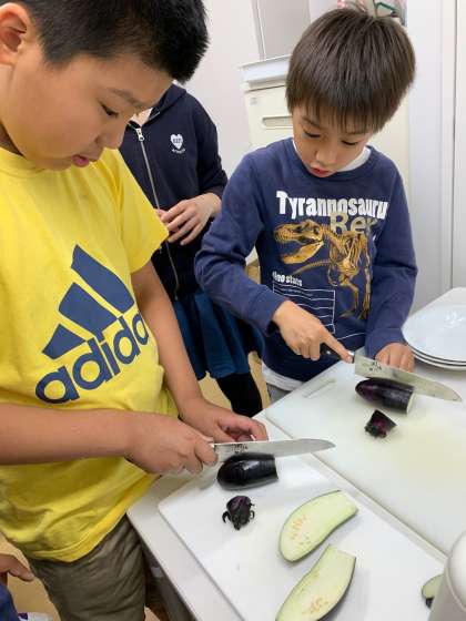 学校菜園クラブ今年度初の収穫祭が行われました。「なす」です。