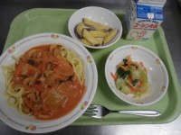 今日のおすすめメニューは、「飛び魚のさつま揚げ」と「明日葉のツナマヨ和え」です。飛び魚と明日葉は両方とも東京都の島、八丈島でとれた食材です。明日葉の名前は、芽をつんでも明日には新しい芽が出てくることに由来しています。本当はそんなに早くは出てこないですが、とても生育が早いというたとえです。東京都の食材を味わっていただきましょう。(お昼の放送)