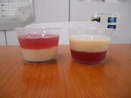 また、デザートはクランベリージュースと豆乳を使って紅白ゼリーを作りました。今年は2種類作りました。赤組の人は赤が上のゼリー、白組の人は白が上のゼリーを食べてくださいね。