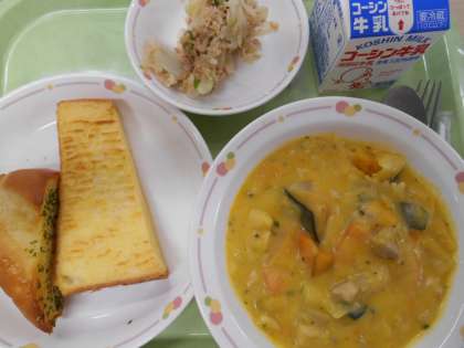 フレンチトーストは、たくさんのたまごと牛乳を混ぜたものをパンにつけて焼いたパンです。 さて、今日は文化発表会コラボ給食2回目です。1年生と2年生です。1年生の合奏曲「黄色いリボン」イメージして、黄色いかぼちゃシチューにリボンのマカロニを入れました。