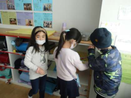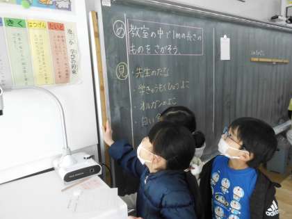 算数の『長さのたんい』の学習では1mものさしを使って、教室の中の1mの物探しをしました。子供たちのふりかえりには「1mだと思ったものが意外ともっと長かった」「予想とは違って1mより短かった」など書かれていました。様々な物を測る中で、1mの量感覚を感じることができました。