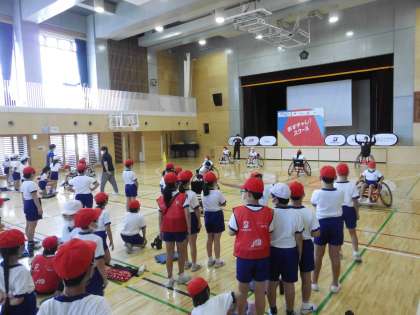 実際に、競技用の車いすに乗る体験をしました。操作が難しい様子でしたが、貴重な体験をして目が輝いている子供たちの姿が印象的でした。
