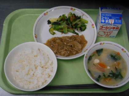 今日は、ごはんがすすむしっかりめの味付けをした「豚肉の生姜焼き」です。しょうがやにんにく、りんご、たまねぎのすりおろしと、しょうゆやみりんなどの調味料で味付けしました。豚肉にはごはんをエネルギーにかえるビタミンB1が多く含まれます。