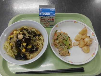今日の給食のラーメンにはわかめがはいっています。わかめには、骨や歯を強くする「カルシウム」や体の調整や余分な塩分を外へ出す「カリウム」などの栄養があります。ラーメンにはほかにも、コーンやもやしが入っていて、バランスもよく、しょうゆ味なので味もよい一杯です。みなさんが好きな食べ物と組み合わせて、食べやすいようにしたので、ぜひ食べてみてください