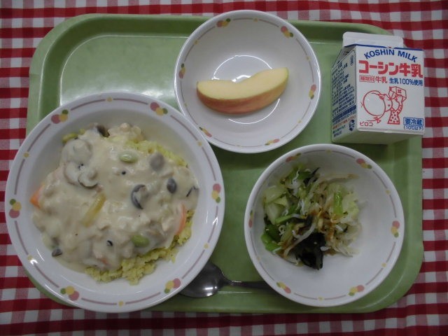 今日の給食には、ターメリックライスにきのこホワイトソースを